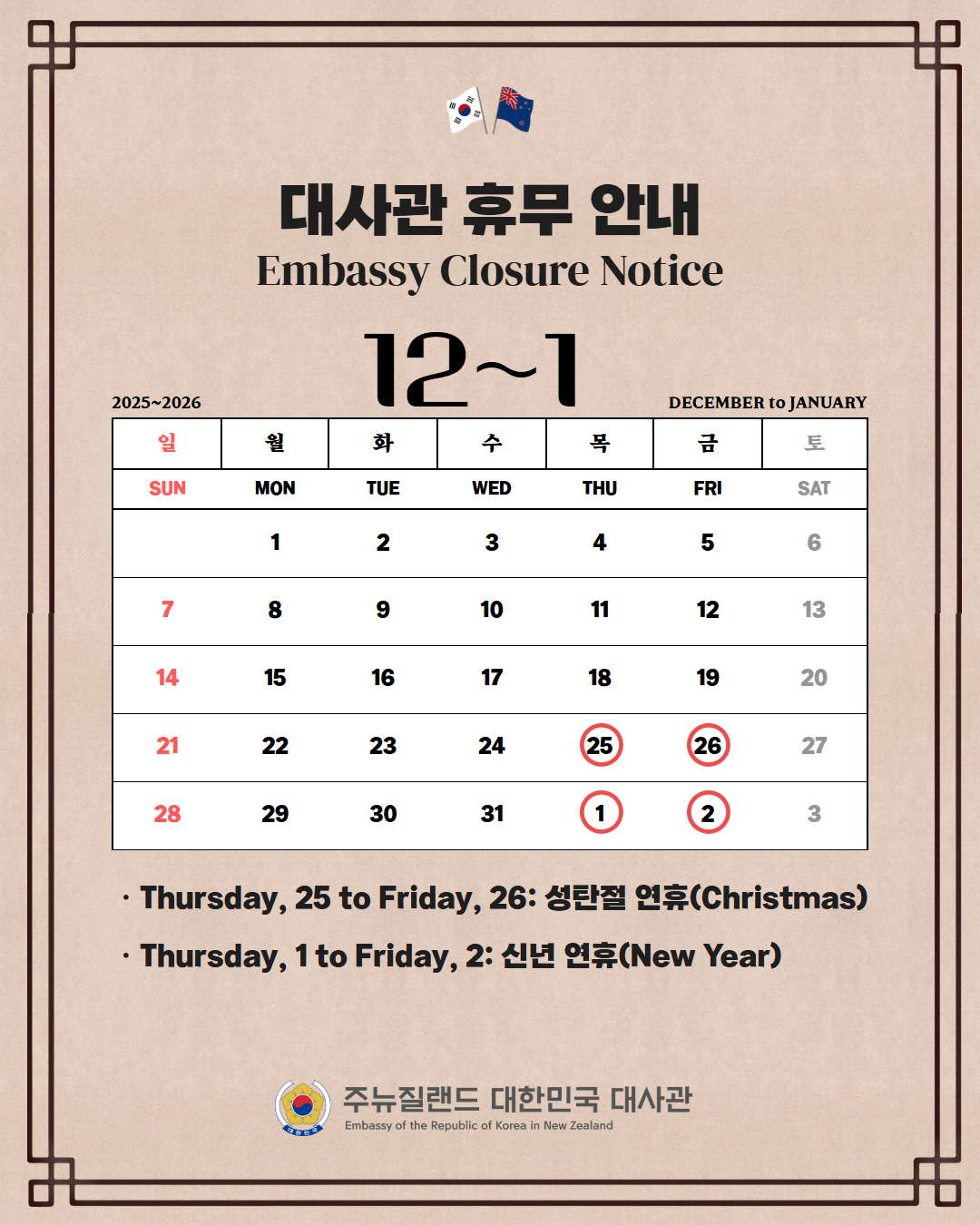우리 대사관의 연말/연시 휴무일을 아래와 같이 공지 합니다.